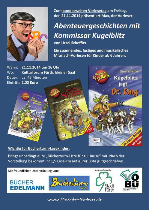 Am Freitag, den 21.11.2014 findet der bundesweite Vorlesetag statt. Mehr als 70.000 VorleserInnen beteiligen sich in vielen deutschen Städten an dieser Aktion. Unterstützt vom Kulturreferat der Stadt Fürth, der Volksbücherei Fürth und der Buchhandlung Edelmann hält Max in Fürth die Fahnen vorlesetechnisch hoch: